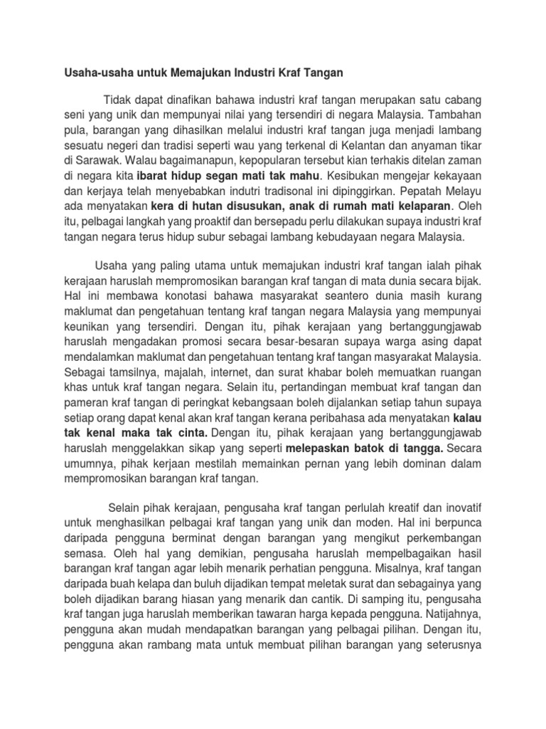 Usaha-usaha untuk Memajukan Industri Kraf Tangan Tidak dapat dinafikan bahawa industri kraf tangan merupakan satu cabang seni yang unik dan mempunyai nilai yang tersendiri di negara Malaysia. CONTOH KARANGAN Usaha-usaha memajukan industri desa Pada masa ini. Kraf Komuniti Ku merupakan inisiatif Perbadanan kemajuan Kraftangan Malaysia Kraftangan Malaysia untuk membangunkan komuniti setempat di bawah program.